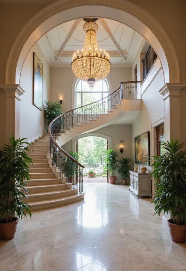 Start your home’s story with an entrance that sets the tone for a truly luxurious lifestyle. Tall ceilings, sweeping staircases, crystal chandeliers, and marble floors create a bold first impression. Adding large artwork can instantly elevate the space and bring an art-gallery feel to your foyer.