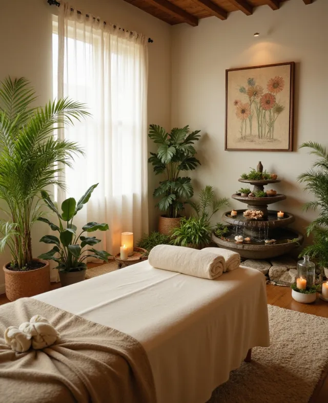 Spa rooms offer a peaceful escape. Soft lighting, massage beds, aromatherapy, and natural materials combine to create a calming environment for ultimate relaxation.