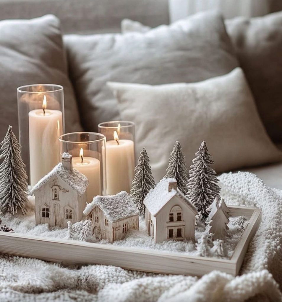 Warm white string lights or small candles can instantly create a festive mood. Place them thoughtfully on shelves, tables, or window sills to add warmth without creating visual noise.