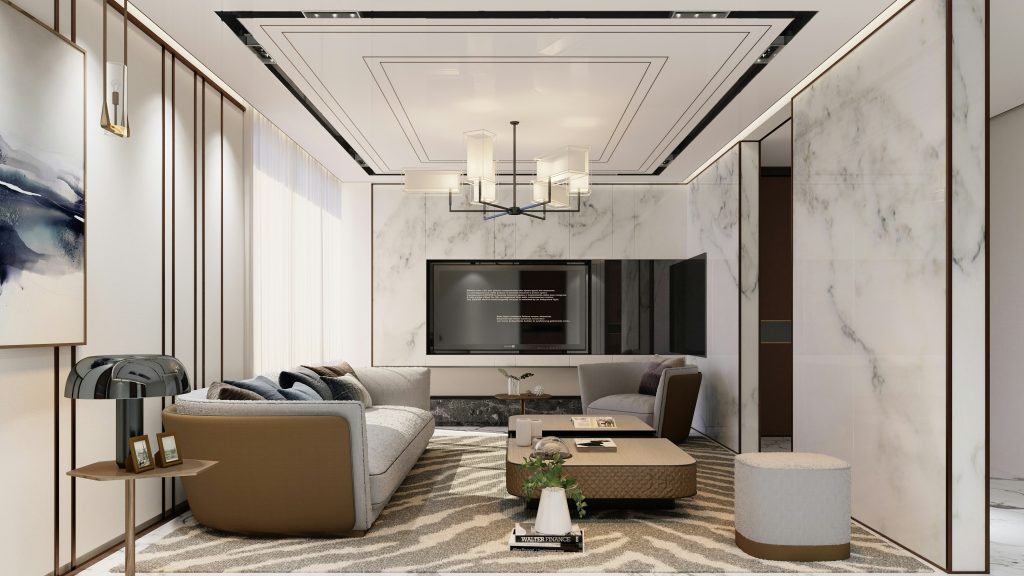 Luxury is often defined by the materials used. Marble coffee tables, velvet sofas, leather armchairs, and natural wood accents instantly elevate the space. Mixing textures—such as soft fabrics with polished surfaces—adds depth and visual interest without overwhelming the design.