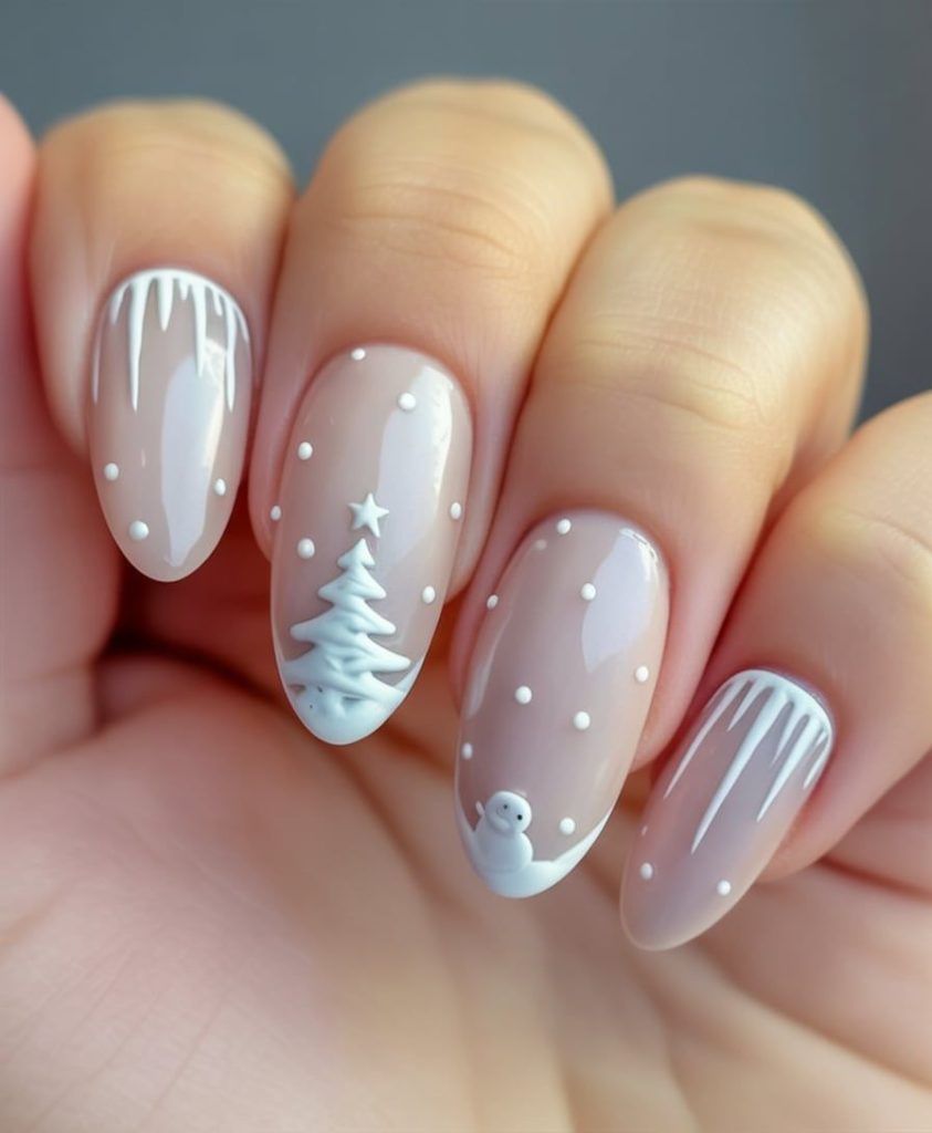 Neutral shades like beige, blush, or light pink create a clean base. Add subtle Christmas details such as tiny snowflakes, gold lines, or a single accent nail to keep the design minimal yet festive.