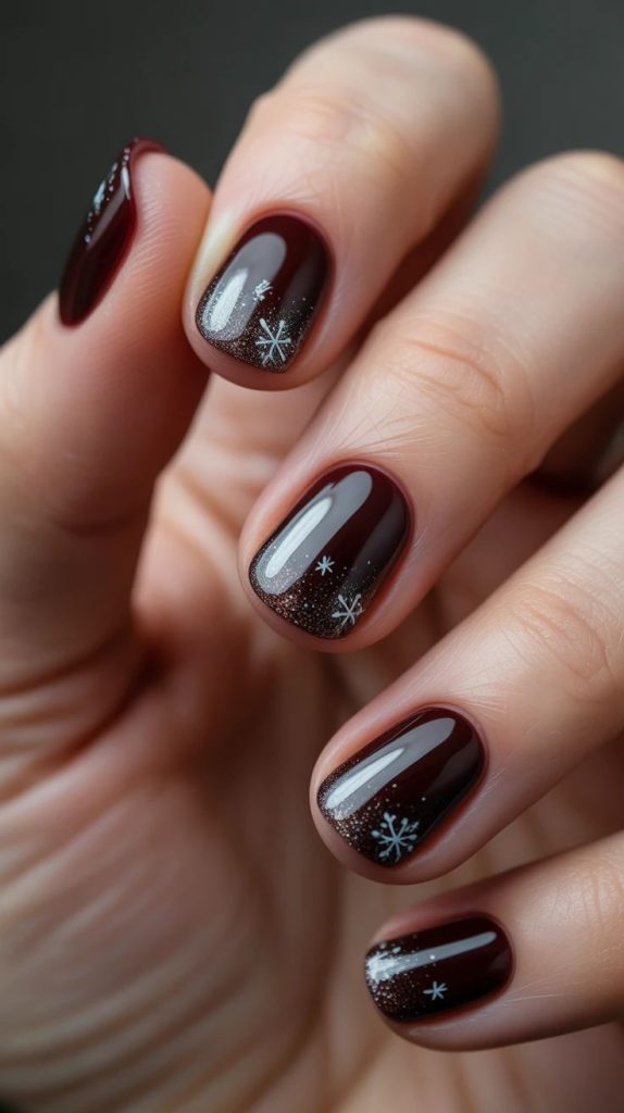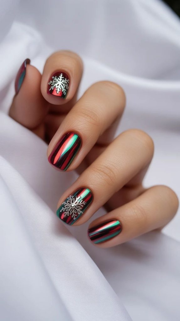 Keep most nails simple and add detail to just one nail. A snowflake, glitter overlay, or metallic detail on a single accent nail keeps the look balanced and classy.
