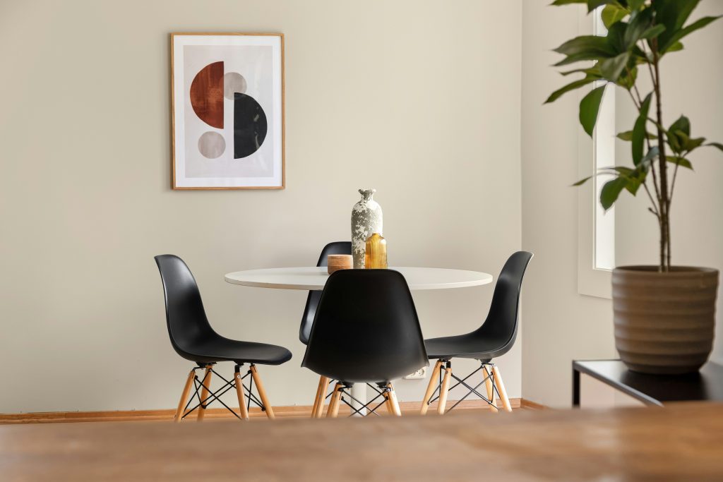 Stick to a neutral base—such as white, beige, gray, or soft wood tones—and add subtle accents for contrast. Black details, metallic finishes, or muted earth tones work beautifully in modern dining spaces and help create a polished look.