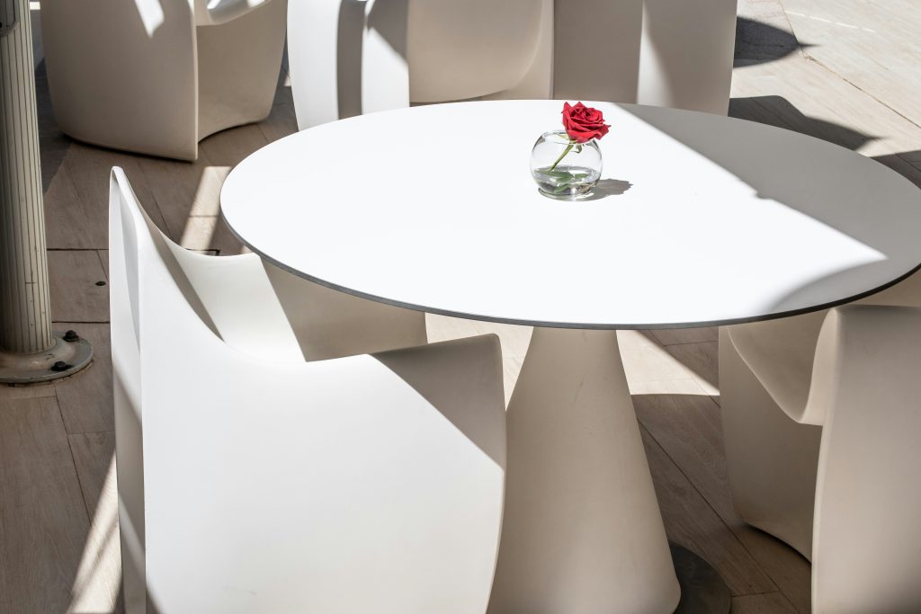 When decorating a round table, balance is key. Opt for centerpieces that are low or medium in height to maintain open sightlines. If you prefer a taller element, keep it slim and simple to preserve the modern aesthetic.