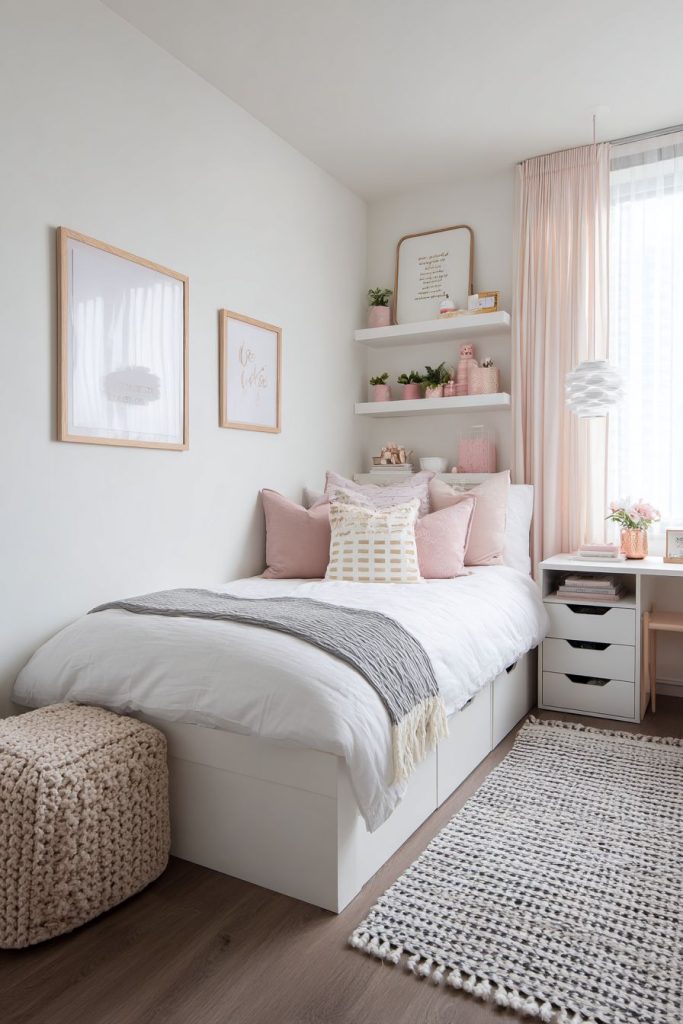 Hidden storage keeps clutter out of sight. Use under-bed storage, built-in cabinets, and decorative baskets to maintain a neat and organized look.