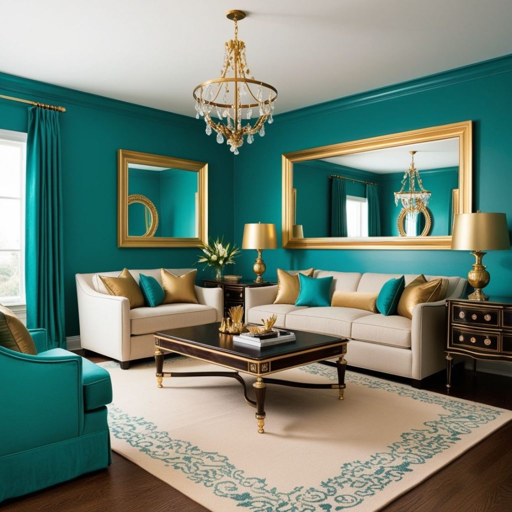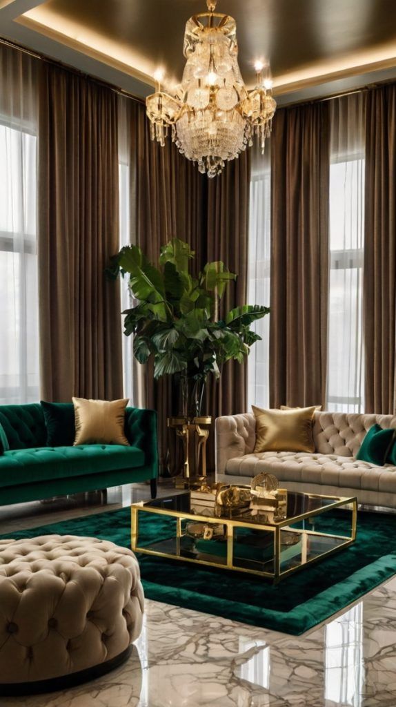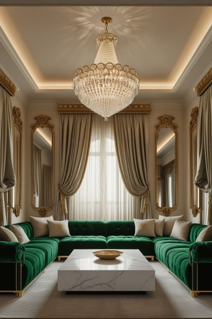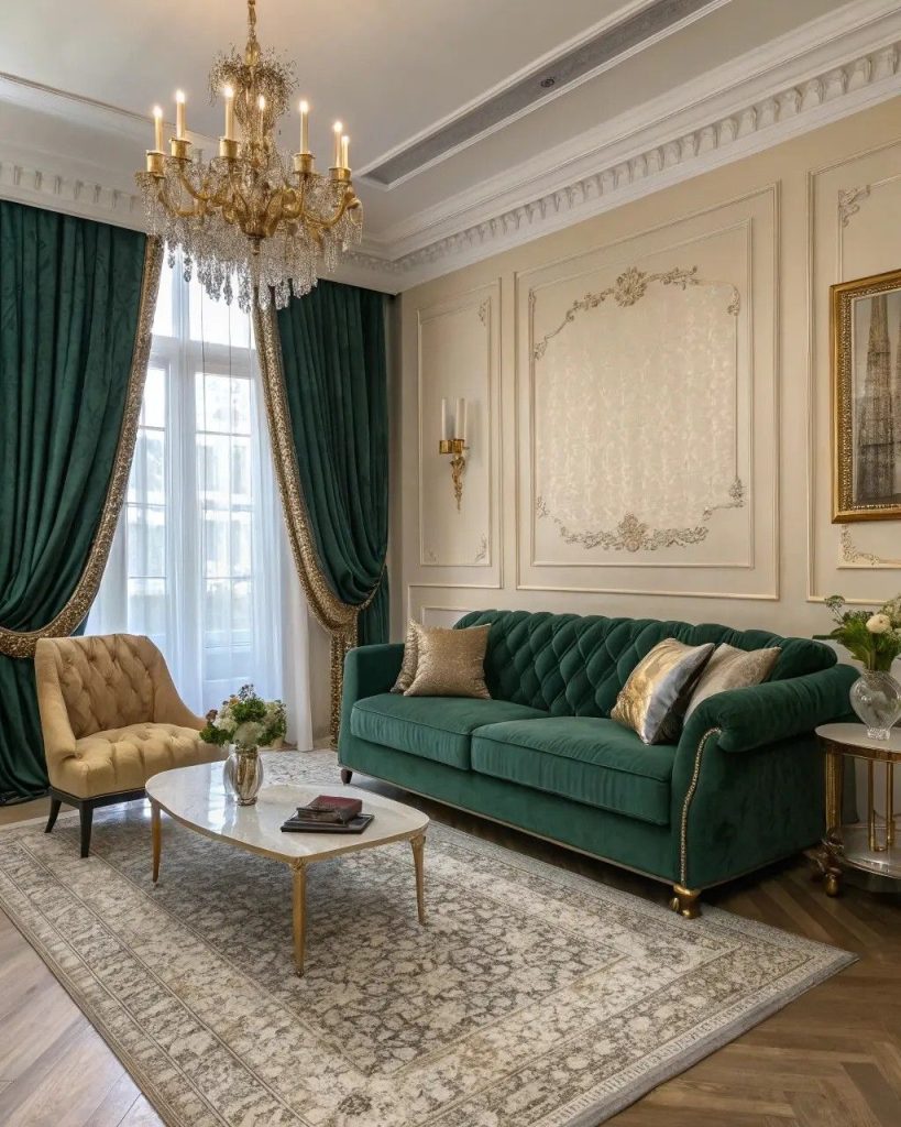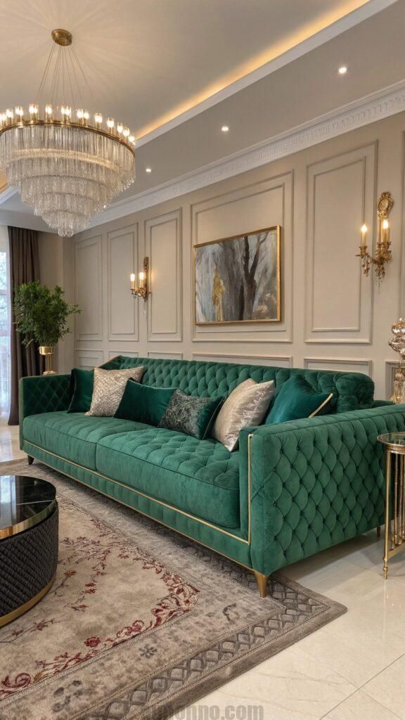 Darker green shades like emerald or forest green add depth and sophistication to a living room. They work especially well with velvet sofas, gold or brass accents, and rich wooden furniture for a refined and timeless look.